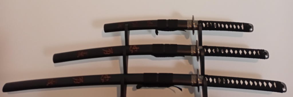 Ensemble katana, wakazashi et tanto à 3 épées basé sur le katana du capitaine Nathan Algren du film de 2003 Le dernier samouraï. Katana mesure 104 cm de long, wakazashi 82 cm de long et tanto 59 cm de long. Lames en acier au carbone avec raccords en alliage de zinc. Livré avec un support en bois pour 3 épées.