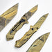 The Fire and Steel - Bamboo Forest Folding Knife offers a unique and stylish design, perfect for collectors and outdoor enthusiasts. Featuring a tan, beige bamboo print on its handle, this knife combines aesthetic appeal with practicality. Available in two distinct styles—one with a square tanto point and the other with a classic rounded knife tip—both knives provide exceptional cutting performance. Please note that since each knife is handmade, the print may vary slightly from item to item, meaning the one you receive may not be identical to the one pictured.