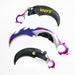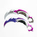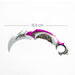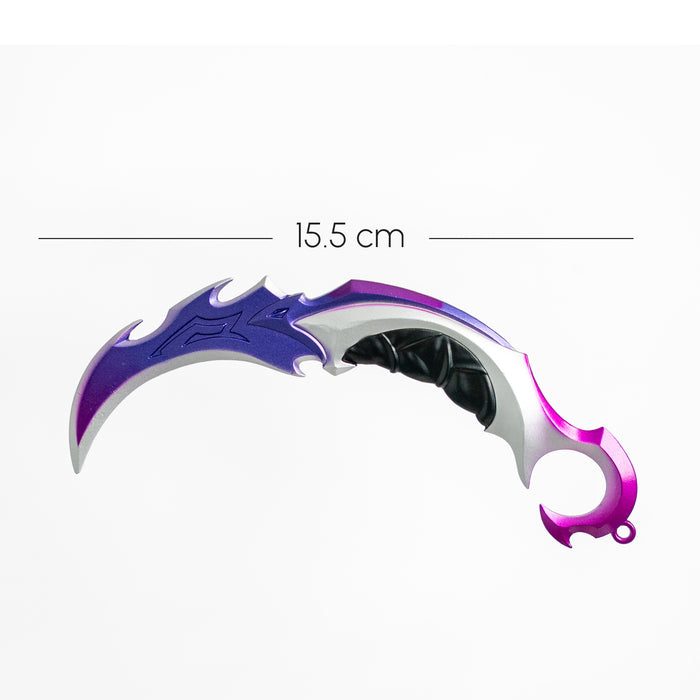 The Reaver Karambit Replica from Valorant is a striking real blunted zinc alloy collectible, ideal for display, cosplay, or photoshoots. Measuring 15.5 cm in overall length, this high-quality replica features a sleek design with a curved blade inspired by the iconic Reaver Karambit from the game. Available in three eye-catching styles—silver blade, purple blade and blue blade (note that the exact placement of hues may vary)—the karambit comes with a durable leather sheath, complete with metal snaps and loops for easy carrying. This non-sharp replica is perfect for fans and collectors looking to add a piece of Valorant to their collection.